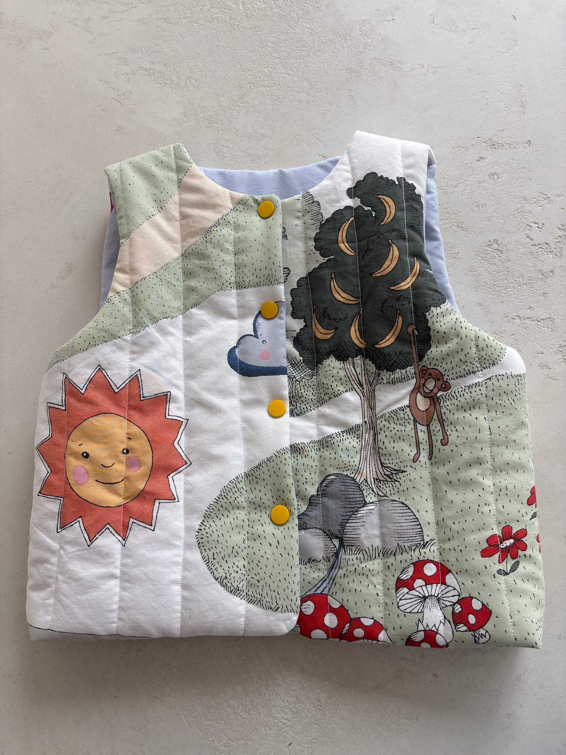 The Lakes Vest is a handmade, sustainable layering piece for kids, crafted from carefully sourced upcycled fabrics. Designed for everyday wear and endless adventures, it’s cozy without being bulky and made to grow with your child. A timeless staple with heirloom feel. Quilted with medium weight bunting gives it a warm, puffer feel. Snap closure.